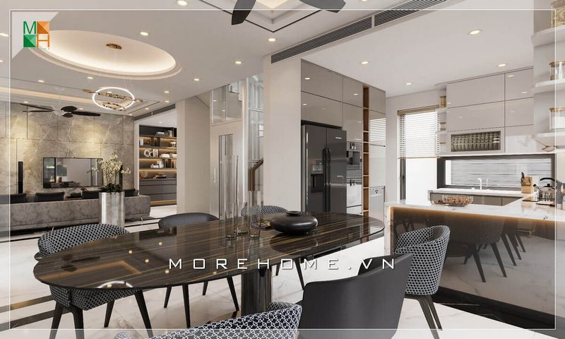Thiết kế nội thất phòng ăn liền bếp hiện đại, tiện nghi cho nhà biệt thự