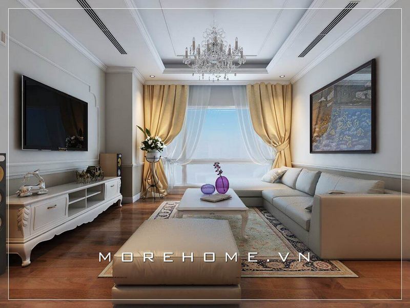 Ấn tượng với bộ sofa gỗ óc chó cao cấp bọc da màu kem mềm mại thiết kế theo phong cách tân cổ điển sang trọng, tinh tế của phòng khách chung cư