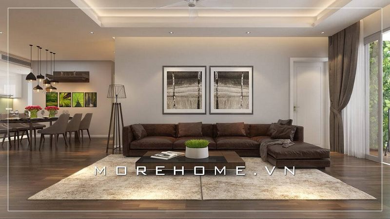 Vẻ đẹp độc đáo của thiết kế sofa phong cách hiện đại kiểu góc tiện lợi ấn tượng trong không gian nội thất phòng khách chung cư với thiết kế bọc da màu nâu ấn cúng và hiện đại.
