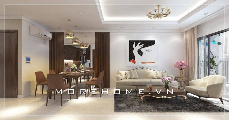 Sofa văng là lựa chọn hoàn hảo cho phòng khách căn hộ chung cư tiện lợi linh hoạt mà ấm cúng với vỏ bọc nhung xám trầm lắng cùng ghế đơn bọc da độc đáo, sang trọng.