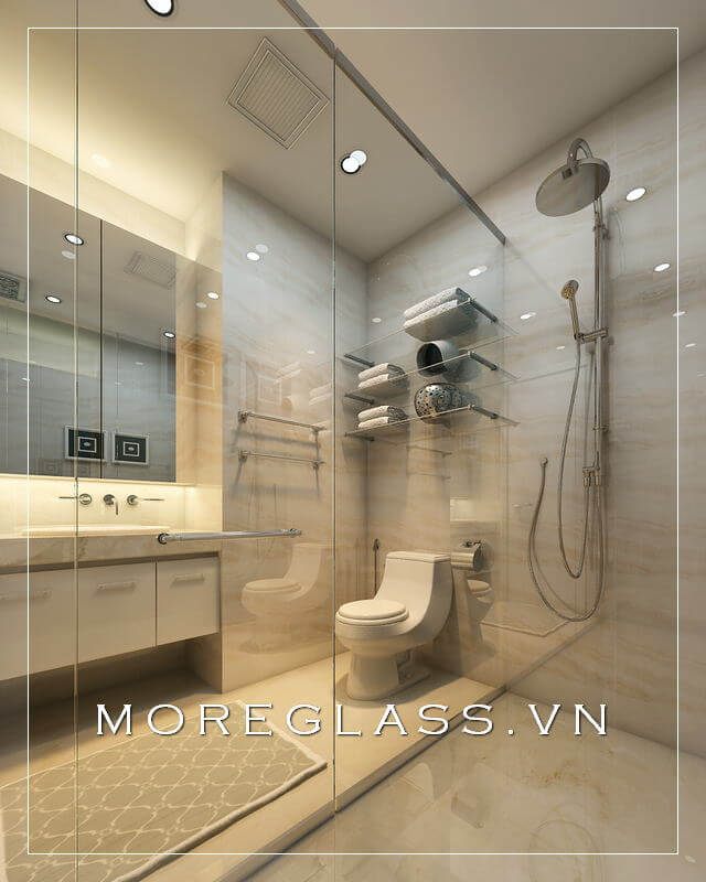Phòng tắm hiện đại với những thiết bị như kệ tủ lavobo gỗ nhỏ gọn màu trắng, gương trang trí, phòng tắm kính đẹp và các thiết bị vệ sinh cao cấp.