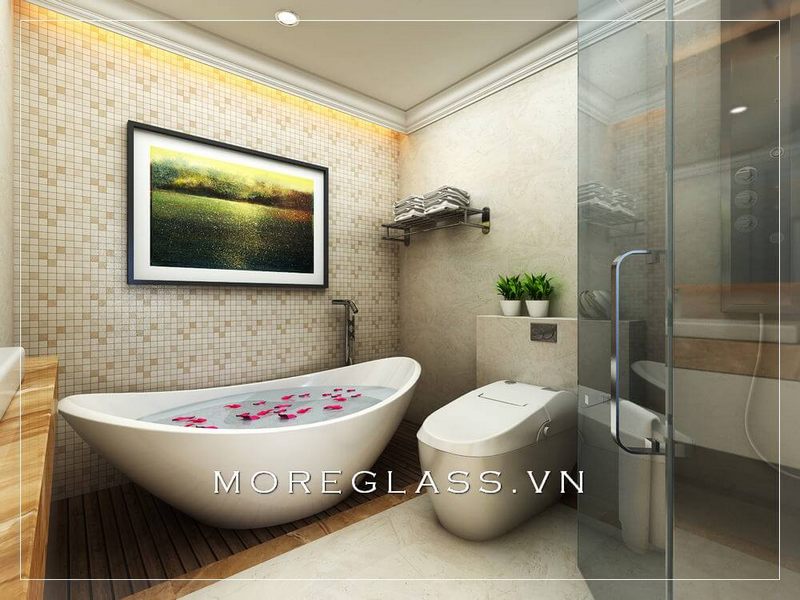 Thiết kế phòng tắm khách sạn cao cấp có bồn tắm nằm sang trọng mang đến không gian thư giãn tuyệt vời cho gia chủ.