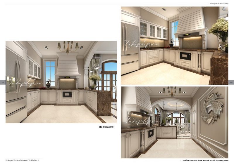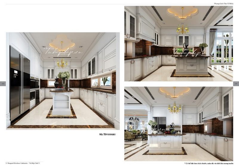 Thiết kế nội thất cho phòng bếp biệt thự, nhà phố có phong cách tân cổ điển với màu trắng làm chủ đạo, kính ốp bếp màu nâu thống nhất với viền đá lát nền.