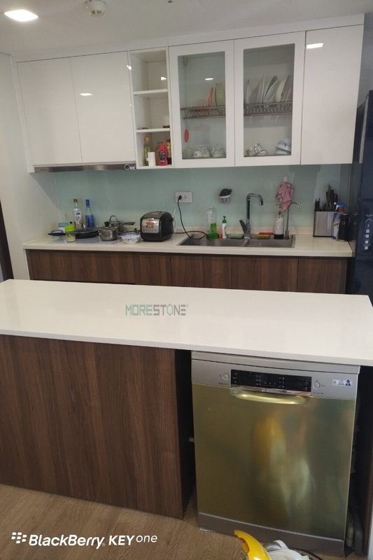 Vẻ đẹp nhẹ nhàng và mát mẻ của màu xanh ngọc của kính ốp bếp cường lực do MoreHome hoàn thiện đã thu hút nhiều chủ nhà.